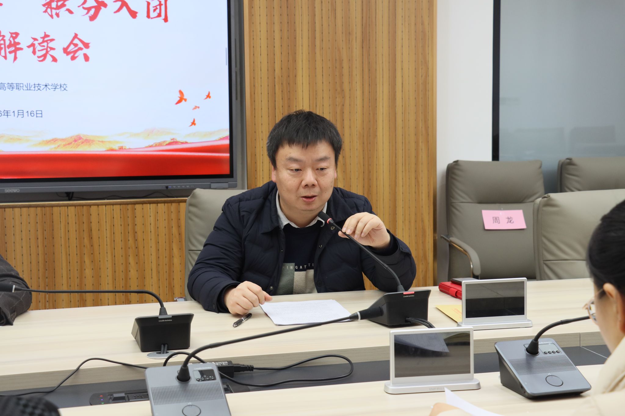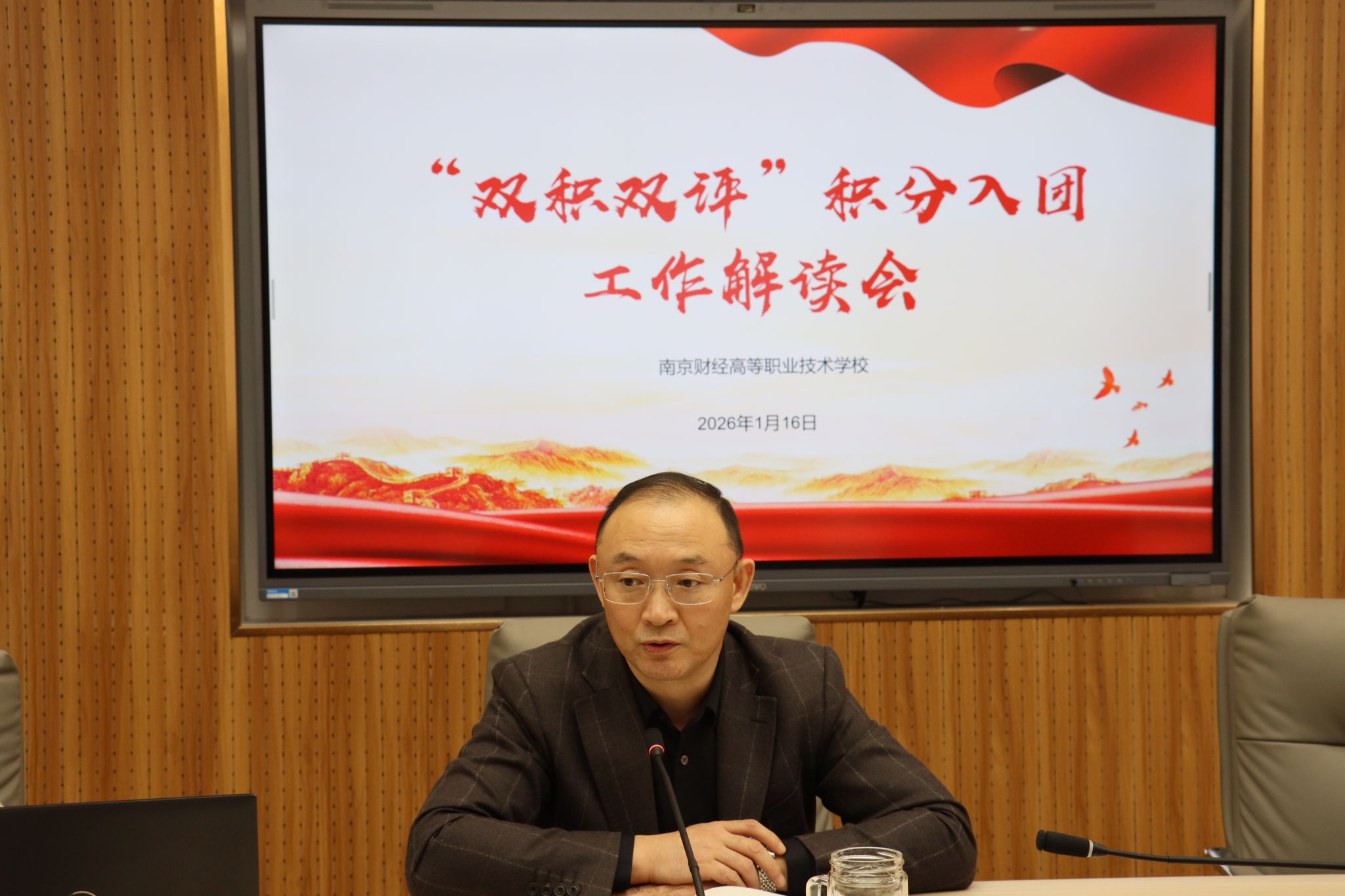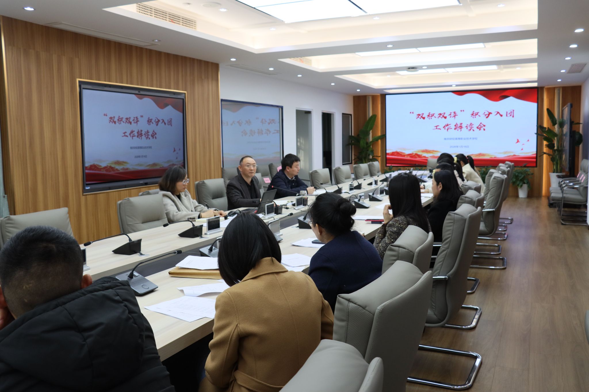1月16日下午在莫愁路校区一楼会议室召开“双积双评”积分入团工作解读会,副校长姜峰、学生工作部主任王祥、各系德育主任及团总支书记参会。校团委书记潘渺琛主持会议并解读相关工作,明确团员发展规范、积分方案及落实要求,为后续工作锚定方向。