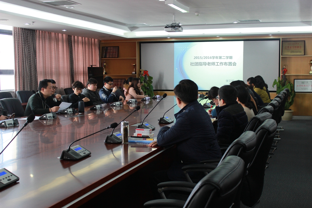 为进一步加强学生社团管理工作,深度提高学生社团活动质量,3月7日下午,学校2015/2016学年第二学期社团指导老师工作布置会在江宁校区召开。会议由学生工作部陈阳副主任主持,全体社团老师参加。