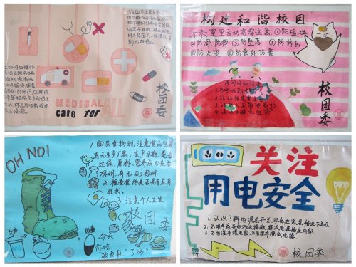 在此次活动中,校宣传部的干部们用独特的画风、绚丽的图案、生动的文字展示安全的重要性。“世界最遥远的距离不是生与死,而是我就在你身边,你却看不见我”,用图文并茂的方式提醒我们关注空气污染安全,倡导低碳绿色生活;美人鱼与海豚合力救起落水者的卡通形象画,提醒着大家应该远离危险水域,防止溺水危险;漫天的大火与浓烟,仿佛瞬间把人拉进了火海当中,黑底白字画法更警示着我们应该时刻重视消防安全。此外,还有食品安全、用电安全、交通安全、医疗安全等提醒。宣传部的干部们将精心制作完的十几张海报张贴在教学楼内同学们经常路过的走廊处,时刻提醒着大家关注安全问题,落实安全行动。