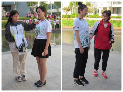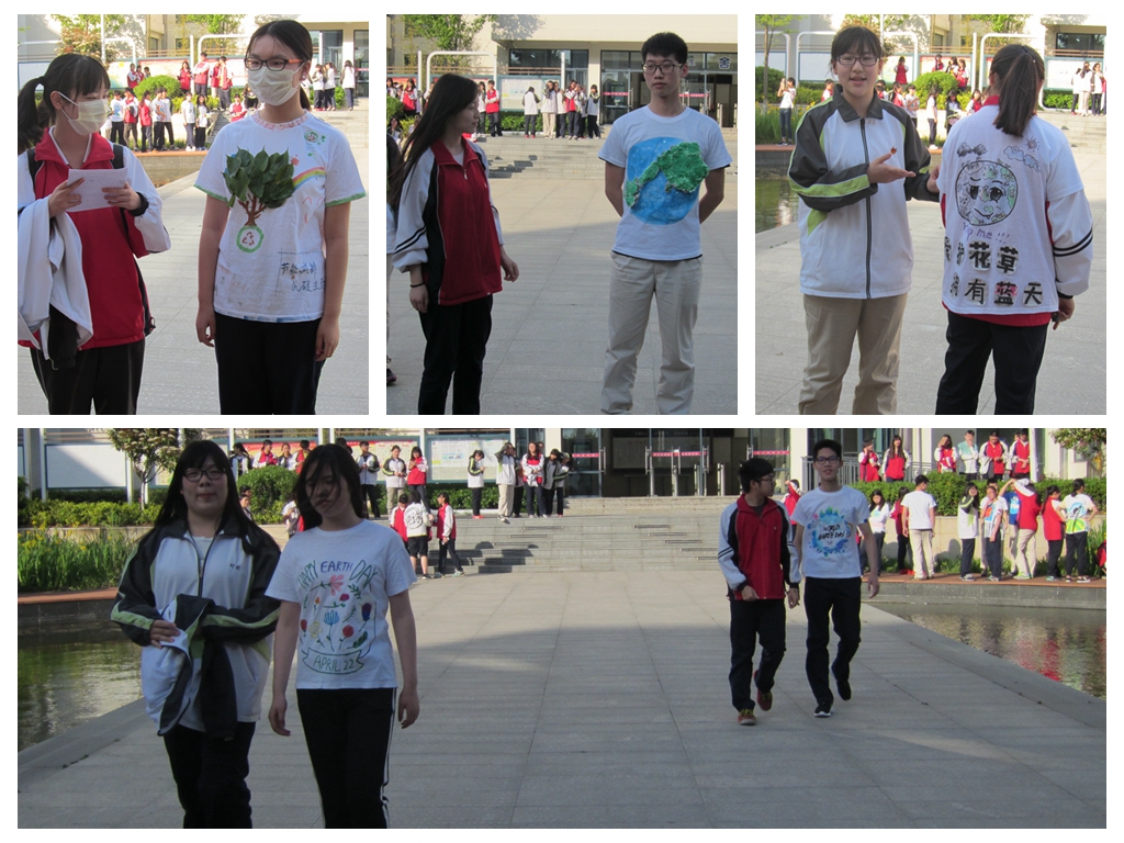 4月19日下午4时20分,各班宣传委员带领本班的“模特”,在江宁校园喷泉走廊上进行现场T台展示秀。当“模特”缓缓向评委走来时,一旁的解说员也对本班“创意T恤”的设计和所传达的环保理念进行了解说。瞧,51411班充分利用废弃的饮料瓶裁剪成树叶形状,涂上淡淡的绿色,拼贴在绘制好的叶脉上,寓意着资源再生,持续发展;51304班则利用校园里的落叶,让衣服上的“枯藤老树”立刻生动立体起来,寓意着落叶归根,生命循环;51311与51309都利用流苏剪裁,流苏随风飘舞,像刚刚抽芽的柳条,寓意地球的生生不息;51308班将废弃的报纸揉搓成地球各大洲的形状,组成一个地球,提醒大家节约用纸,保护地球。T台展示秀吸引了许多同学驻足观看,现场气氛热烈。
