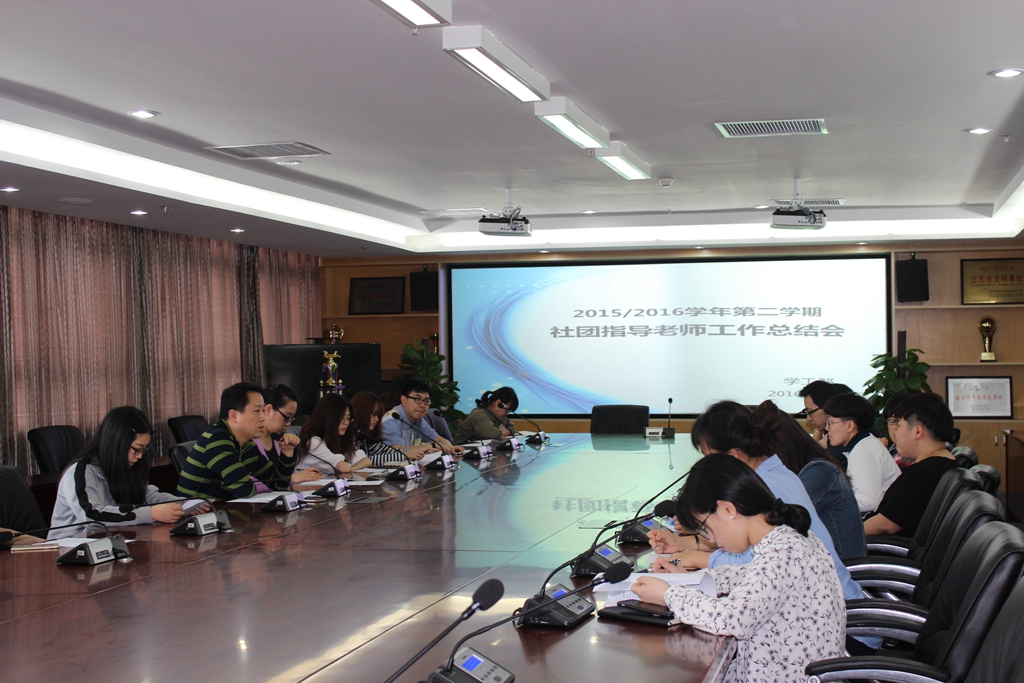 6月1日中午,我校2015/2016学年第二学期社团指导老师期末总结会在江宁校区十二楼大会议室召开。全体社团老师参加了此次会议,会议由学生工作部陈阳副主任主持。