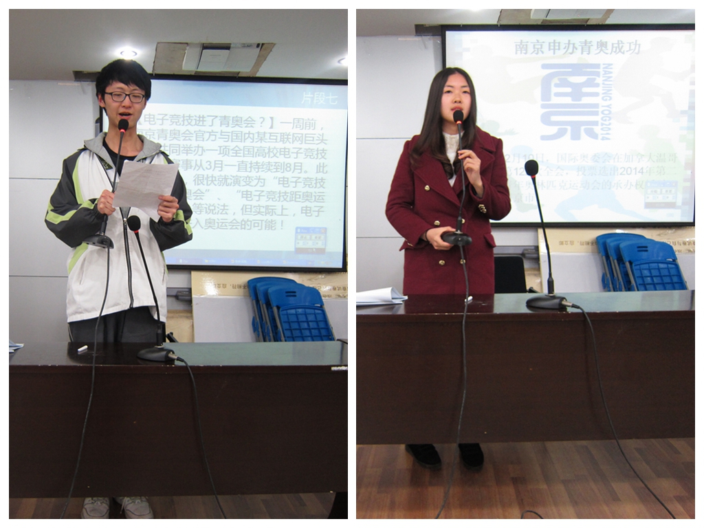 随着2014青奥会的临近,“青奥”与我们校园生活的关系愈来愈密切了,同学们积极关注青奥、参与青奥的热情也随之高涨。为了展示学生风采,挖掘学生潜力,在学生中选拔优秀的主持人,我校2014年校园文化节项目之一的主持人大赛于3月19日在夫子庙、新街口和江宁三个校区同时启动。此次活动由学生工作部组织,参赛对象为2011、2012和2013级学生,各班文艺委组成了阵容强大的评审团。本次主持人大赛采用预、决赛制。预赛分为新闻稿朗读和片段主持两个环节。