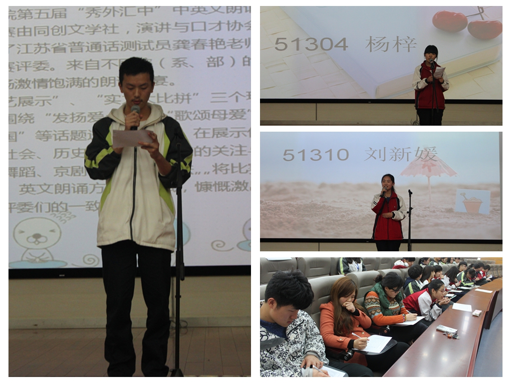 在江宁校区,各班经过精心选拔,推荐了本班同学心中的最佳主持人参赛,评审团由各班文艺委员及各系行政老师担任。有的选手结合自身参与亚青火炬传递的经历讲述了与青奥的难舍情缘,有的选手深情讲述着南京因青奥而发生的点点滴滴的改变。15名选手就如同15颗闪亮的小星星,每一颗都闪耀着不同的光芒,他们怀揣着心中的那一份主持梦想努力着,拼搏着。比赛在激烈的比拼中结束,最后51303班朱飛凡、51304班杨梓、51310班刘新媛、51313班顾严文、51309班鲍敏、51207班王钰雯、51206班吴莺鸿和51306班周阳等8位同学脱颖而出,进入决赛。
