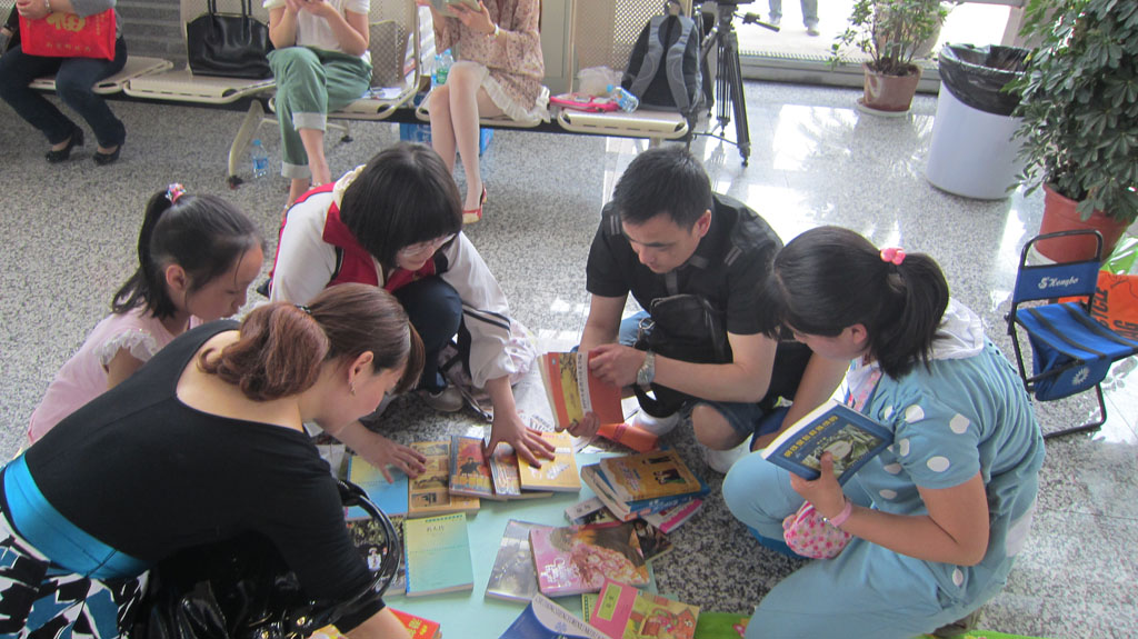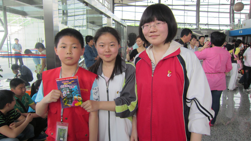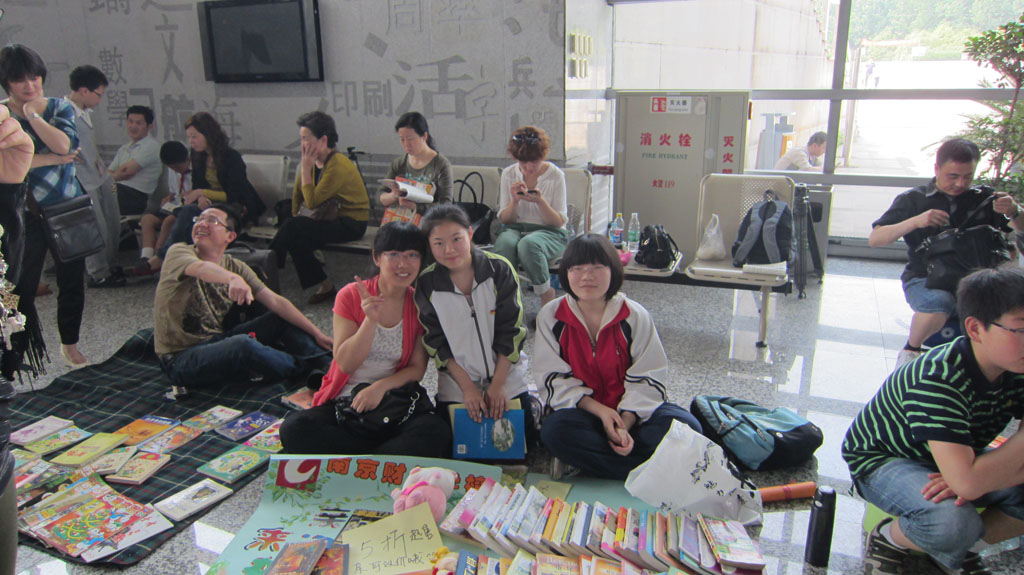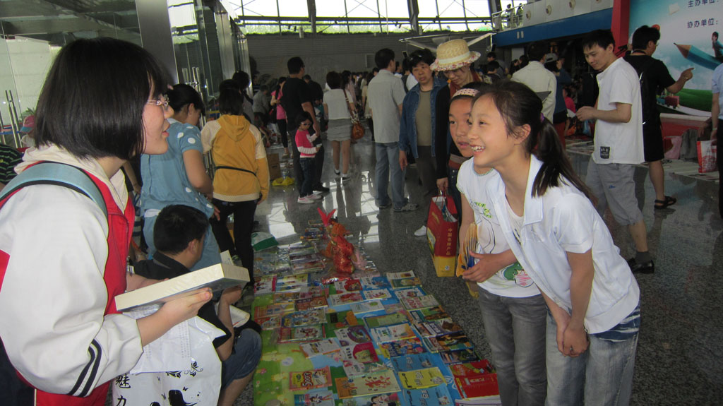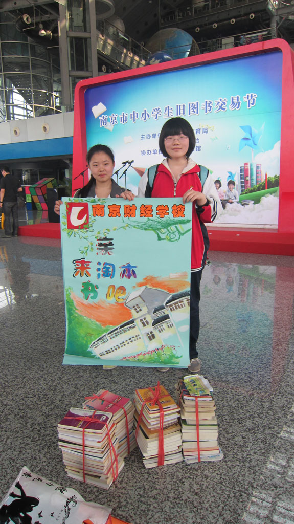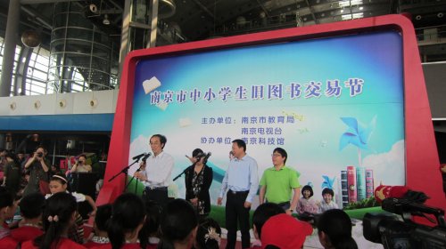 一大早,她们就拎着四捆书和一包玩具来到了南京科技馆。九点钟,市教育局张生副局长主持了开幕式。简短的开幕式后,活动正式开始。在南京科技馆的序厅里,常老师和同学们摆起了书摊。由于精选的书籍以名著类较多,吸引了不少学生和家长前来淘宝,团支书鲁唐宁和刘婧两位同学热情地向围观者解答。期间,同学们有不少难忘的经历:江宁一小的李兰心同学挑选了两本郭敬明小说,几番讲价后,大家被她的诚意打动,以低价进行了交易;另一位来自梅山一中的陈芷蓉同学则邀请鲁唐宁同学去她的书摊,并进行了图书交换。还有南京日报小记者团成员、致远外小的郁天钒同学,他在挑选了自己喜爱的漫画后和我校学生合影留念。