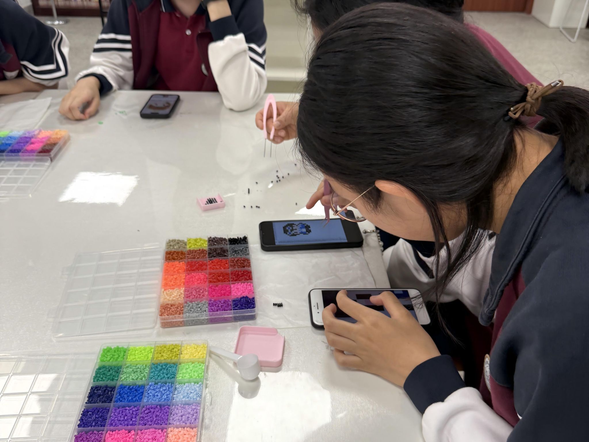 莫愁路校区独具特色的“‘拼’式团圆局”吸引了众多同学驻足。大家围坐在一起,用五彩的拼豆创作出月饼、玉兔等富有节日寓意的图案,将传统元素与现代手工艺术结合。一件件作品不仅展现了同学们的巧思,更传递出团圆与共创的美好愿景。