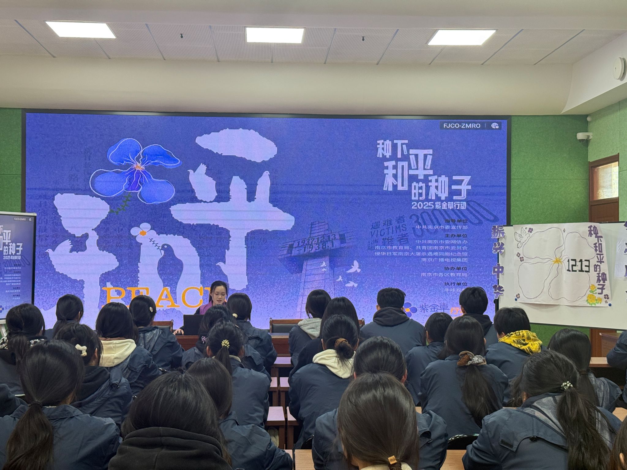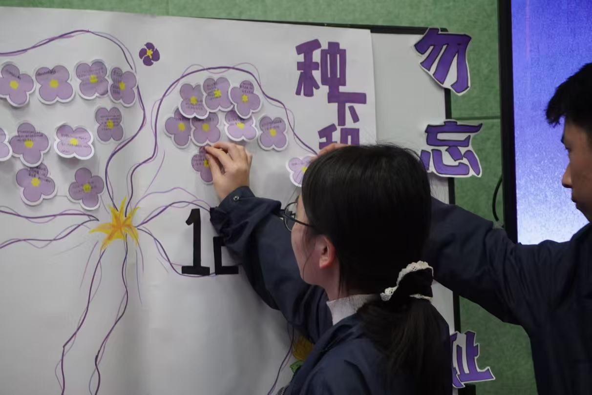在互动环节中,同学们将写有感悟与寄语的紫金草便签贴于手绘展报,拼组成一朵象征希望与坚韧的紫金草。同时郑重佩戴紫金草徽章,完成仪式。活动最后,全体师生共同起立,齐声诵读《和平宣言》,在庄严的誓言中凝聚“铭记历史、珍爱和平”的集体意志。