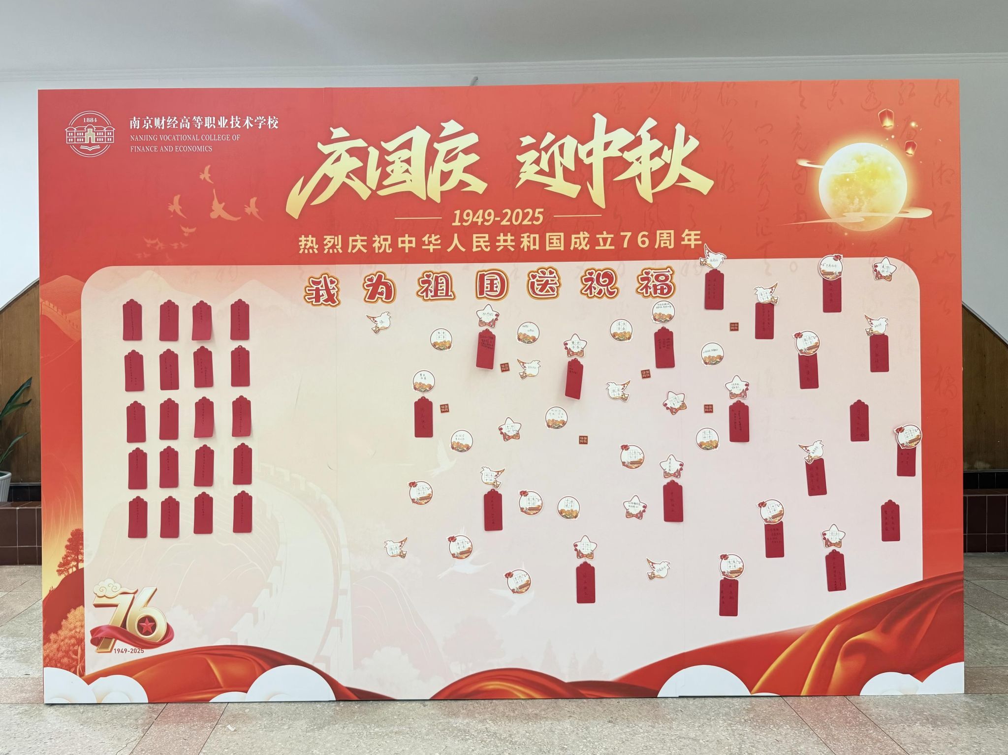 2025年9月29日中午,南京财经高等职业技术学校举办了以“赴明月之约,庆盛世华诞”为主题的国庆中秋双节庆祝活动。校园内洋溢着浓厚的节日氛围,同学们踊跃参与,现场气氛热烈,欢声笑语不断,共同迎接中华人民共和国成立纪念日与中秋佳节的到来。