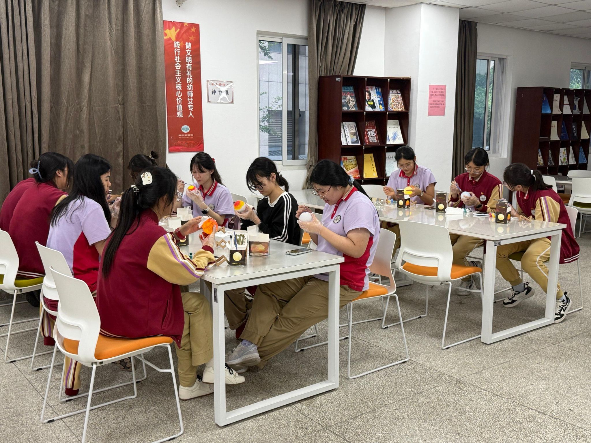 在“巧画月球灯”区域,同学们充分发挥想象力,在圆润的月球灯上绘制出星空、家国图景等各式图案。灯光亮起,一盏盏独一无二的月球灯不仅照亮了现场,也点亮了每个人心中的家国情怀。同学们将自己亲手制作的月球灯带走留念,为这个中秋增添了一份温馨与纪念。